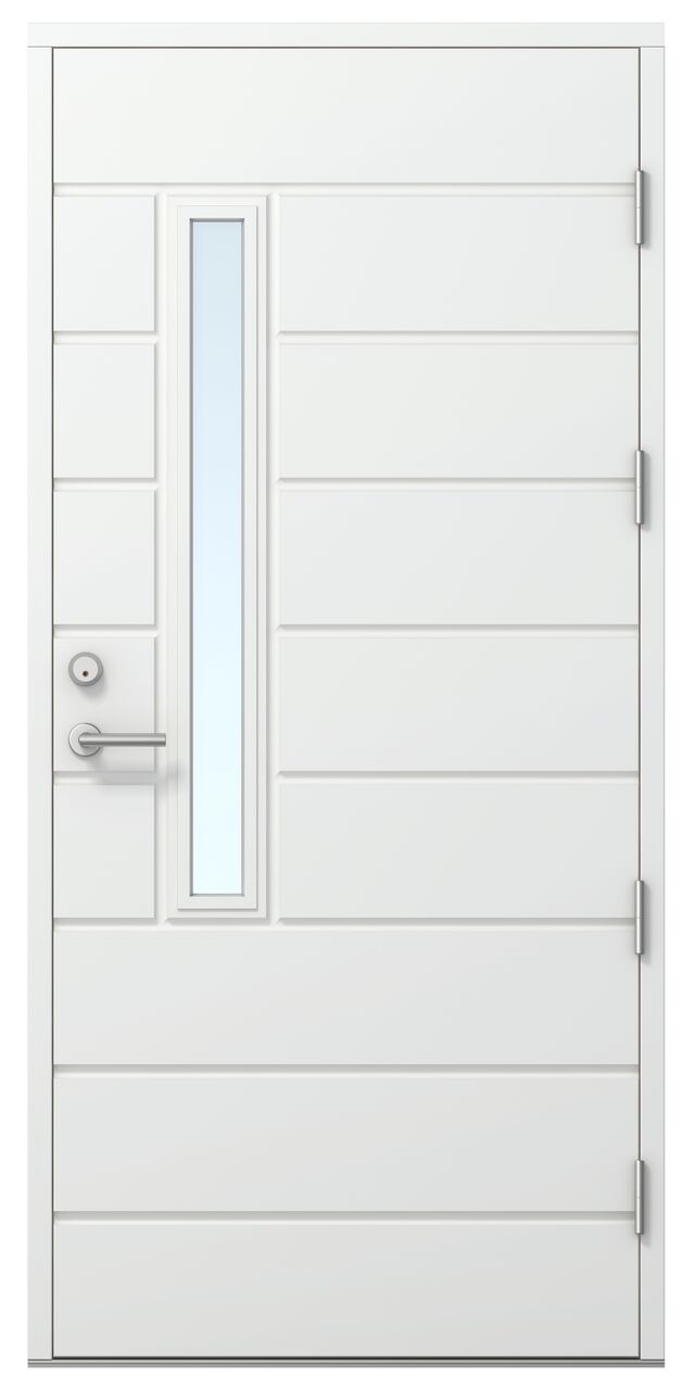 Ovilevy | EPS-lämpöeristetty 86 mm vahva ovilehti. Ovilevyn reunalla liimapuun ja kertopuun yhdistelmä sekä molemmat oven pinnat on alumiinilevyin vahvistettu. Oven pinta säänkestävä HDF-pinta valkoinen NCS S 0502-Y. Ulkopuolella urakuviointi ja sisäpuolelta sileä.