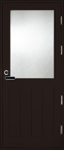 Ovilevy | EPS-lämpöeristetty 62 mm vahva ovilehti. Ovilevyn reunalla liimapuun ja kertopuun yhdistelmä sekä molemmat oven pinnat on alumiinilevyin vahvistettu. Oven pinta säänkestävä HDF-pinta tummanruskea RR32. Ulkopuolella urakuviointi ja sisäpuolelta sileä.