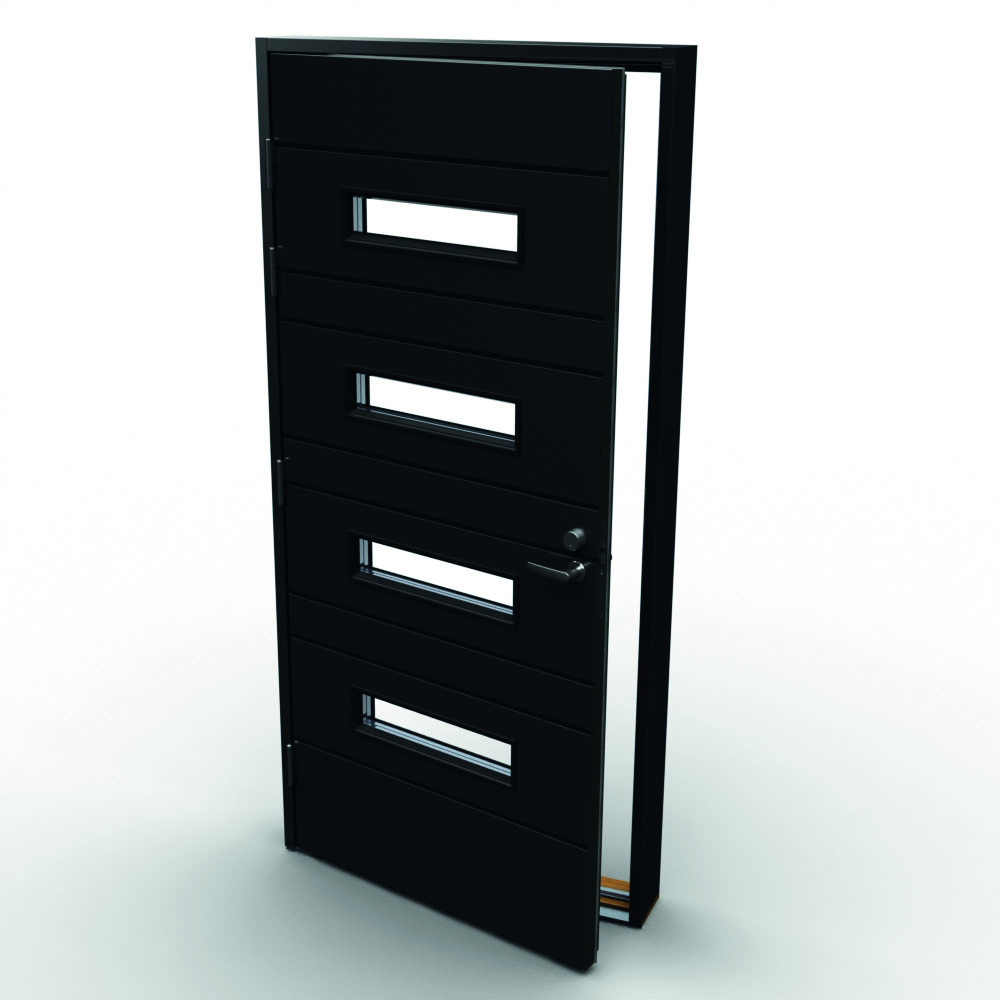 Toivota laadukkaalla kotimaisella ulko-ovella vieraasi tervetulleiksi ja pidä kutsumattomat ulkona. PihlaPron modernissa PP1 ulko-ovessa on kestävä runko, kulutusta kestävä kynnys, kaksi tiivistettä sekä neljä saranaa, jotka tukevat painavaa ulko-ovea. Ovilehti on jäykistetty alumiinilla. Tässä mustassa ulko-ovessa on neljä crepi-koristelasia, jotka päästävät valoa sisään, mutta niistä ei näe kunnolla läpi. Oven ulkopuolella on myös koristeellista uritusta, sisäpuolelta ovi on sileä. Oven rakennetakuu 3 vuotta, suoranapysymistakuu 10 vuotta.