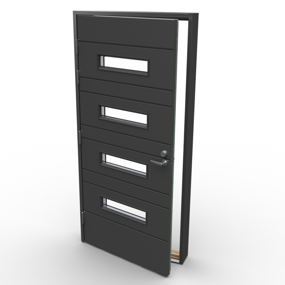 Toivota laadukkaalla kotimaisella ulko-ovella vieraasi tervetulleiksi ja pidä kutsumattomat ulkona. PihlaPron modernissa PP1 ulko-ovessa on kestävä runko, kulutusta kestävä kynnys, kaksi tiivistettä sekä neljä saranaa, jotka tukevat painavaa ulko-ovea. Ovilehti on jäykistetty alumiinilla. Tässä harmaassa ulko-ovessa on neljä crepi-koristelasia, jotka päästävät valoa sisään, mutta niistä ei näe kunnolla läpi. Oven ulkopuolella on myös koristeellista uritusta, sisäpuolelta ovi on sileä. Oven rakennetakuu 3 vuotta, suoranapysymistakuu 10 vuotta.