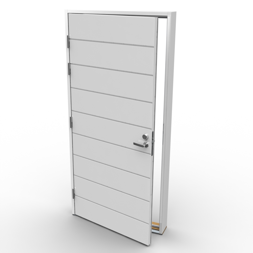 Rakenne: 1-lehtinen, ulospäin aukeava levyrakenteinen ulko-ovi.